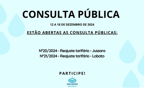 Estão abertas as Consultas Públicas 20 e 21/2024 sobre os pareceres técnicos de reajustes tarifários dos municípios de Jussara e Lobato.
