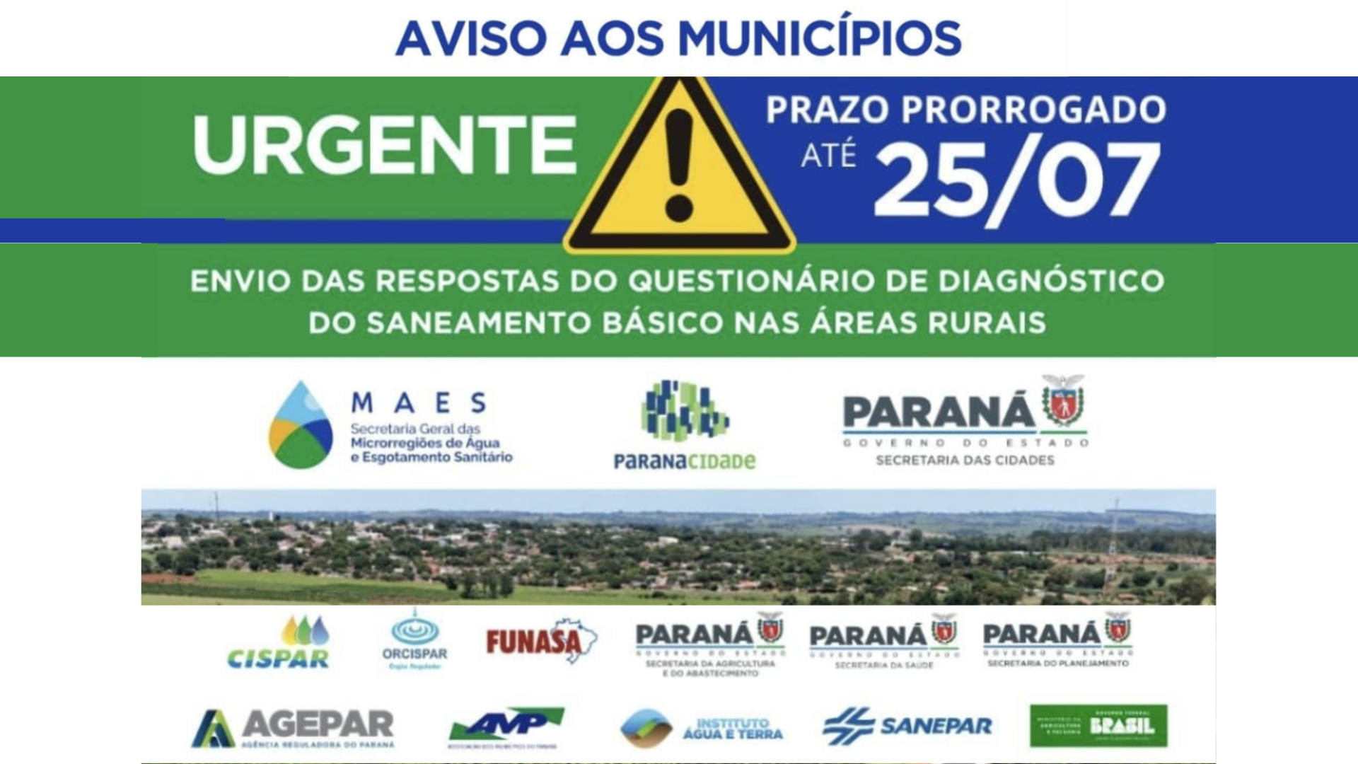 Informamos que o prazo para envio das respostas do Questionário de Diagnóstico de Saneamento Básico nas áreas rurais foi prorrogado até o dia 25/07.